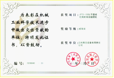 JPTD-1000L平面磁控濺射卷繞鍍膜機(jī)獲獎(jiǎng)證書